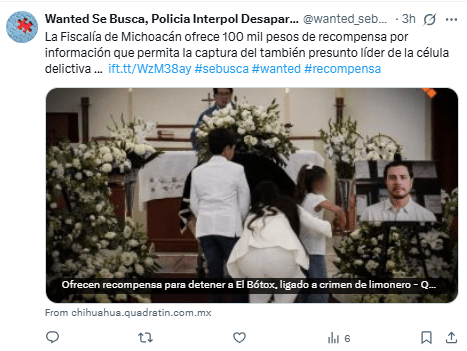 La Fiscalía de Michoacán ofrece 100 mil pesos de recompensa por información que permita la captura del también presunto líder de la célula delictiva Los Blancos de Troya.