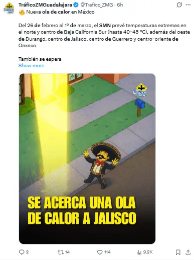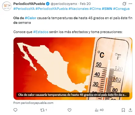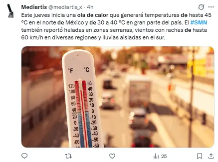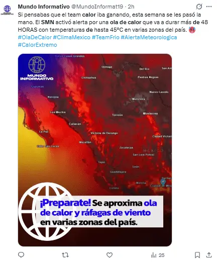 Regeneración, 26 de febrero 2026– El Servicio Meteorológico Nacional (SMN) indicó que a partir de este jueves se pronostica una ola de calor que impactará a seis estados del país, por lo que ha emitido indicaciones para que la gente tome precauciones y evite problemas de salud.