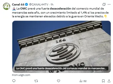 Regeneración, 19 de marzo 2026– La OMC proyectó una considerable desaceleración en el comercio internacional de bienes durante este año, con un crecimiento limitado a 1,4% si los costos energéticos siguen siendo altos debido a la guerra en Oriente Medio.