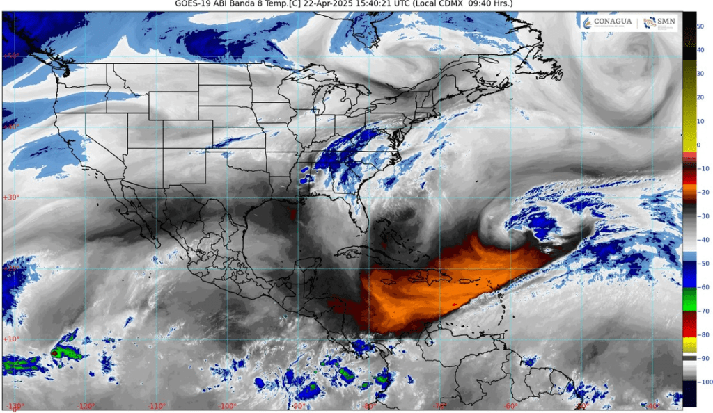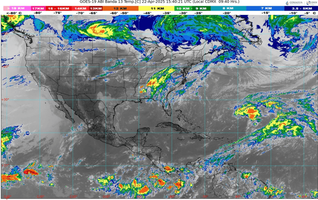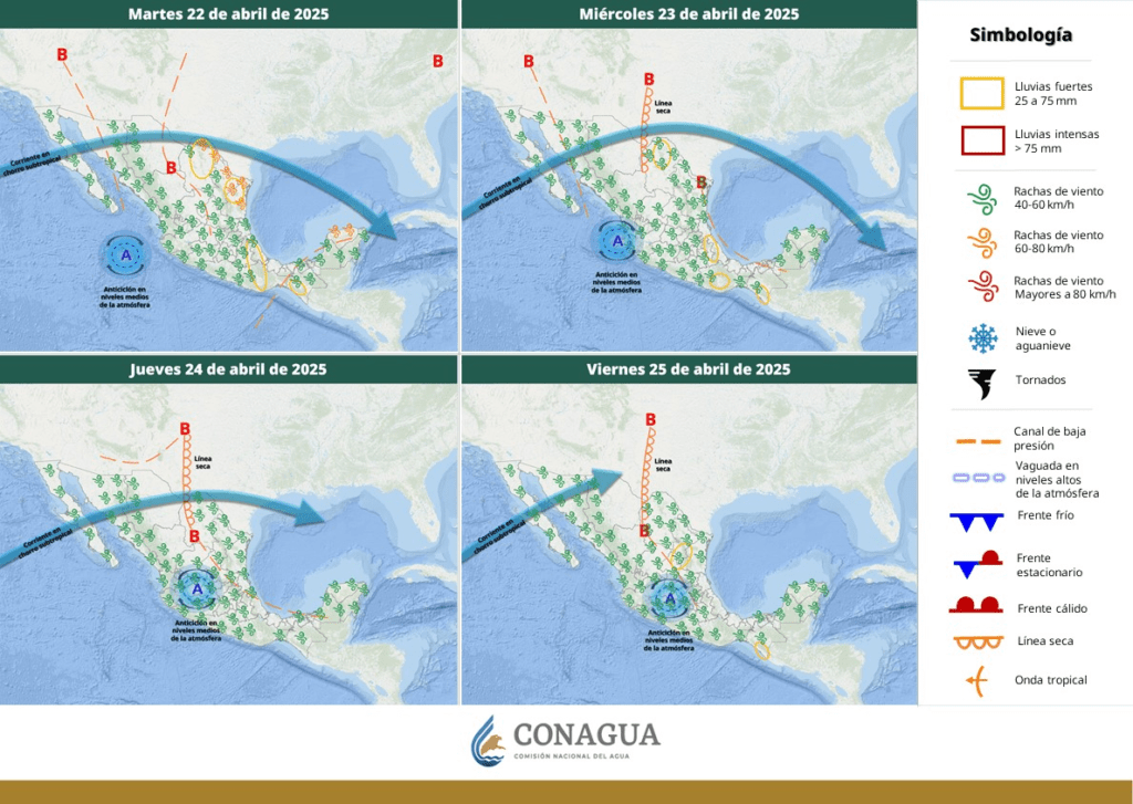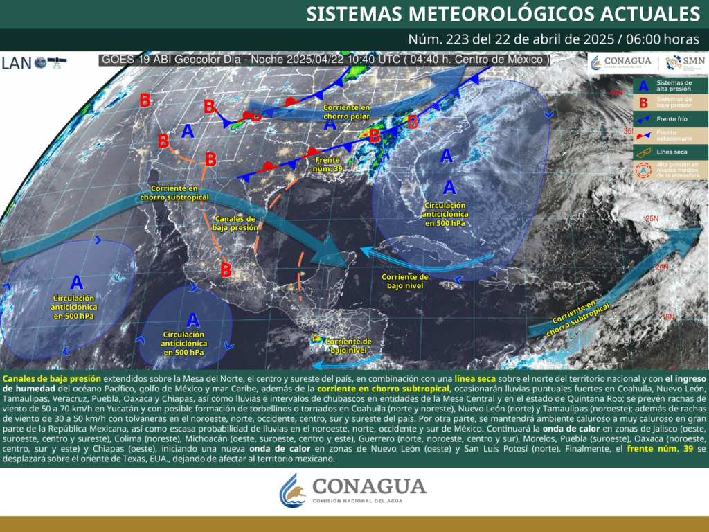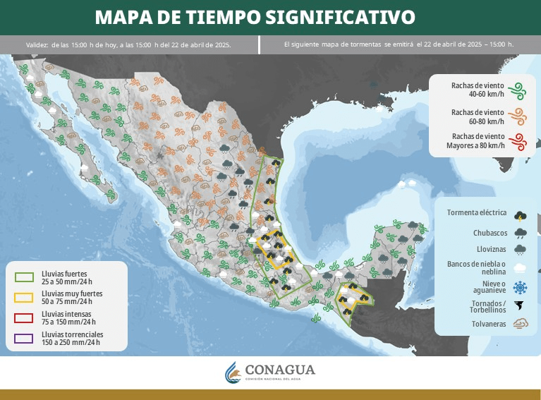 Regeneración, 22 de abril de 2025. El Servicio Meteorológico Nacional informó de lluvias fuertes en zonas de Coahuila, N. León, Tamaulipas, Veracruz, Puebla, Oaxaca y Chiapas.