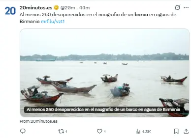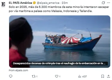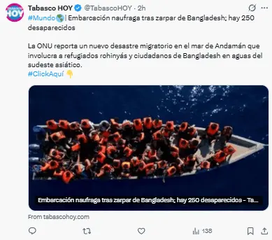 Regeneración, 14 de abril 2026– La Organización de las Naciones Unidas ha señalado que alrededor de 250 refugiados rohingya y ciudadanos de Bangladesh están desaparecidos después de que una embarcación sufriera un naufragio en el mar de Andamán.
