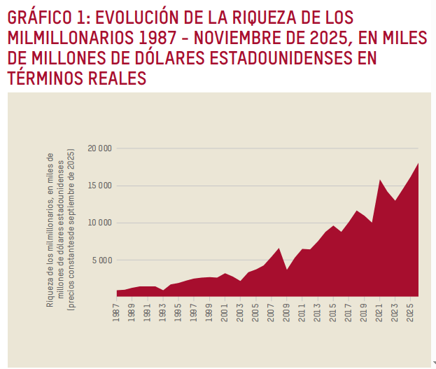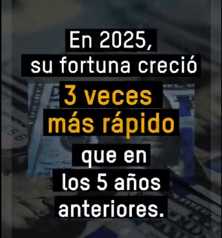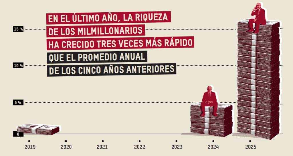 Regeneración, 19 de enero de 2026.– La riqueza de los milmillonarios alcanzó un máximo histórico de 18,3 billones de dólares en 2025. Según Oxfam Intermón, este capital creció un 16% solo en el último año. Esta cifra representa un crecimiento tres veces más rápido que el promedio reciente. El informe se publicó coincidiendo con el inicio del Foro Económico Mundial de Davos.