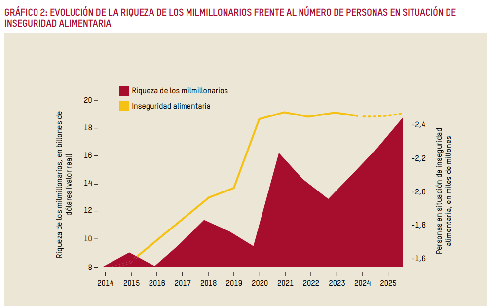 Mientras tanto, casi la mitad de la población mundial vive con menos de 8,3 dólares diarios, y un 28% se encuentra en situación de inseguridad alimentaria.