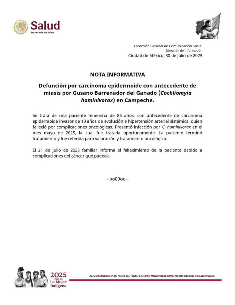Regeneración, 30 de julio de 2025. Por medio de una breve nota informativa la Secretaría de Salud desmintió muerte asociada a miasis por gusano barrenador del ganando.