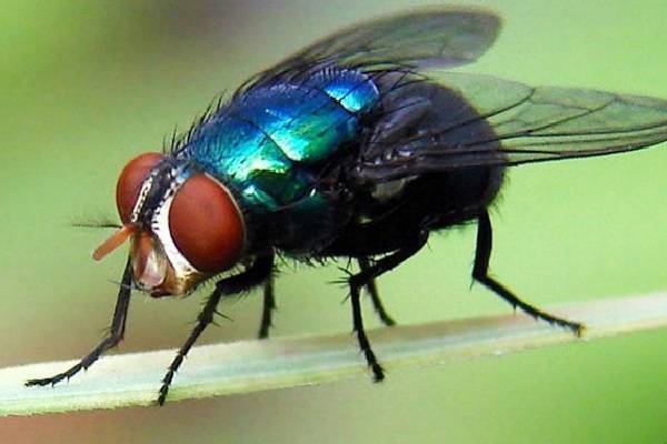 Cochliomyia hominivorax es de aspecto metálico verdoso-azulado con rayas negras en el dorso.