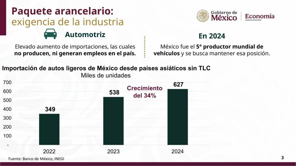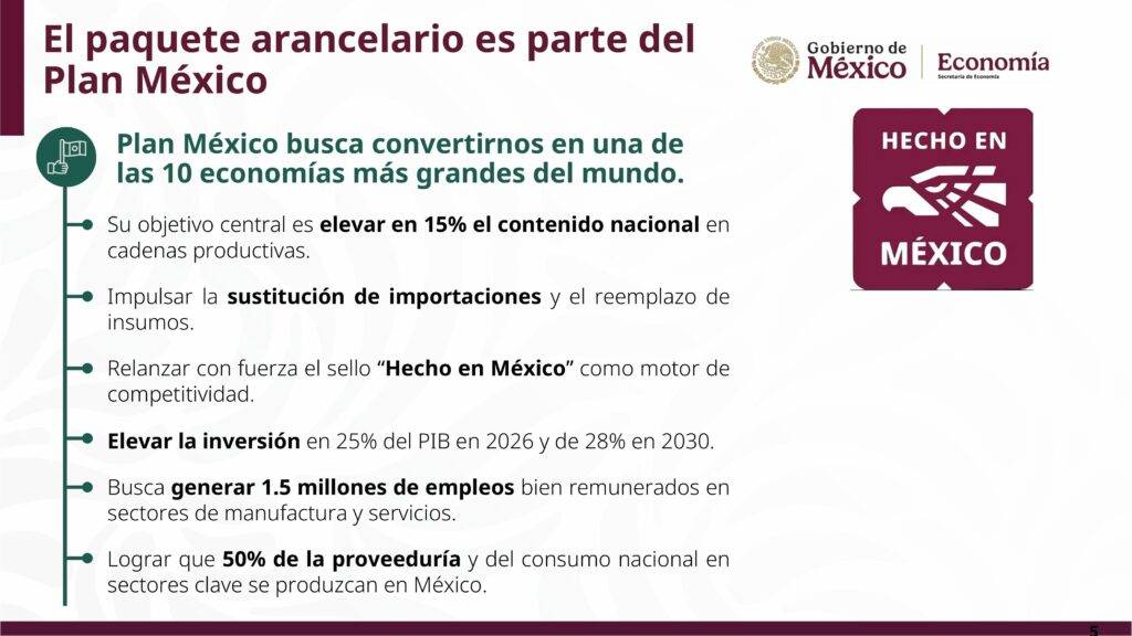 Y, por lo que, a través del paquete arancelario que es parte del Plan México, el objetivo es elevar en 15% el contenido nacional en cadenas productivas.