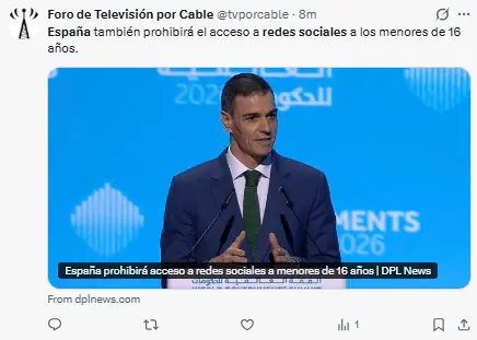 Regeneración, 3 de febrero 2026– En el plenario de la Cumbre Mundial de Gobiernos en Dubái, Pedro Sánchez informó el día de hoy que España prohibirá el acceso a las redes sociales para quienes tengan menos de 16 años.
