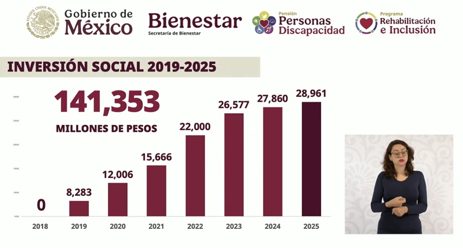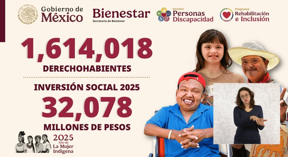 Regeneración, 5 de diciembre de 2025. Este año que está por concluir, la Pensión para el Bienestar de las Personas con Discapacidad se otorga a un millón 614 mil 18 derechohabientes menores de 65 años, a través de una inversión social de 32 mil 78 millones de pesos (mdp).