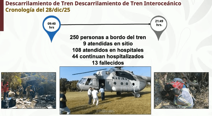 Regeneración, 29 de diciembre de 2025. La presidenta Sheinbaum envió un mensaje de solidaridad con las 13 personas que perdieron la vida tras descarrilamiento en la Línea Z del Tren Interoceánico, ruta Salina Cruz a Coatzacoalcos.
