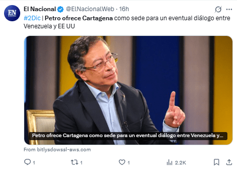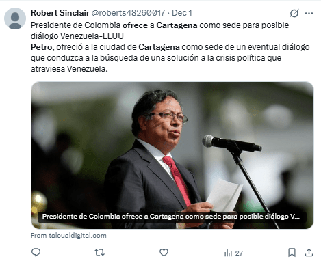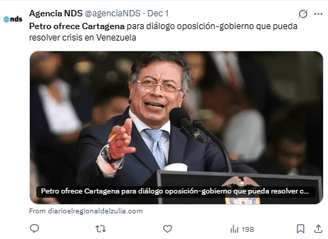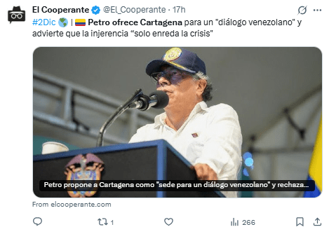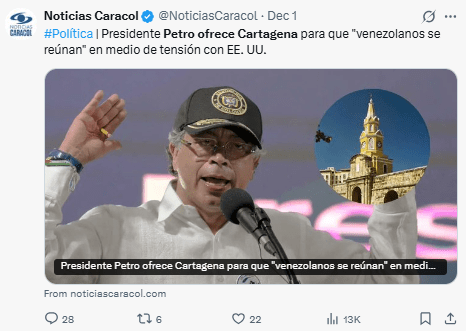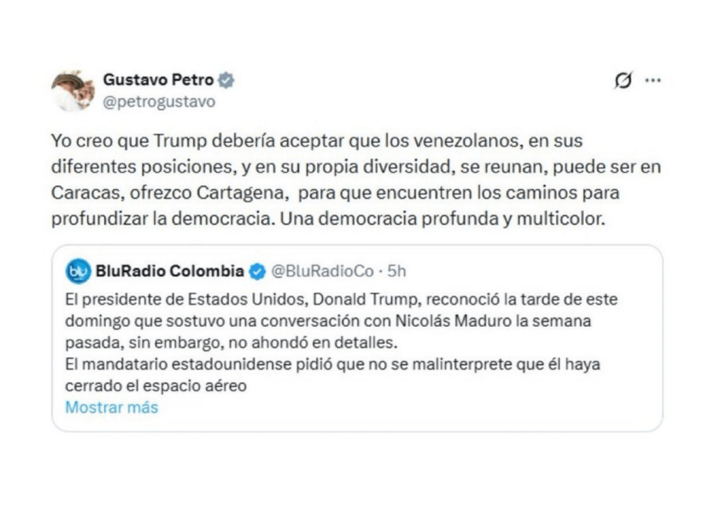 Regeneración, 3 de diciembre 2025– El presidente de Colombia, Gustavo Petro, propuso que Cartagena sea sede de un encuentro entre sectores políticos de Venezuela, en respuesta a la confirmación de una conversación telefónica entre Trump y Maduro.