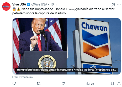 El domingo, mientras viajaba en el Air Force One, Trump declaró haber hablado con las empresas petroleras estadounidenses «antes y después» de la detención.