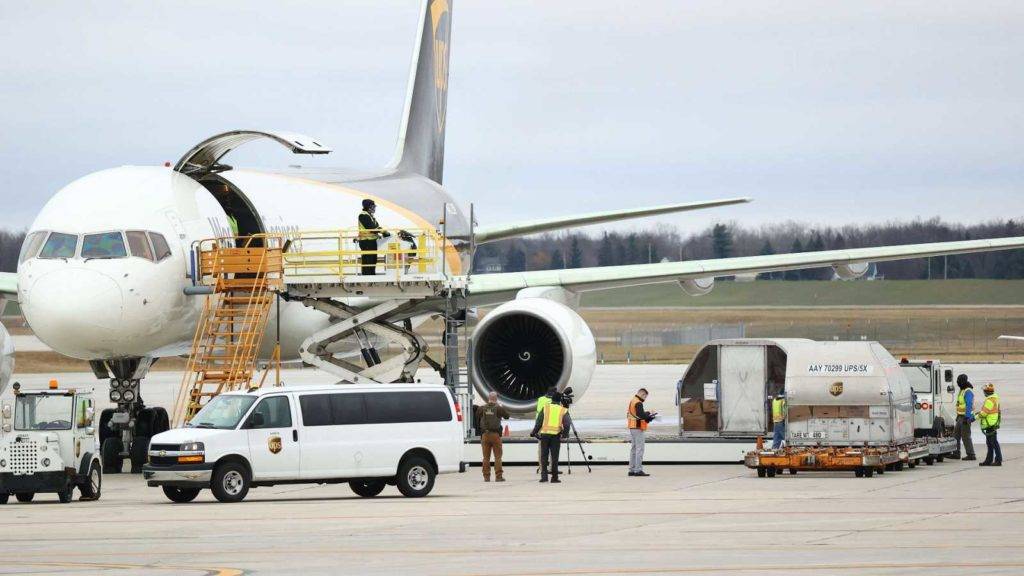 Los camiones pertenecen a las compañías de paquetería Fedex y UPS, quienes en contenedores especiales llevarán las vacunas a todo el país.