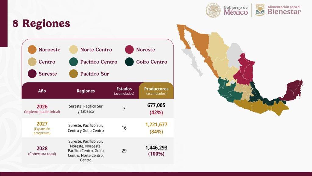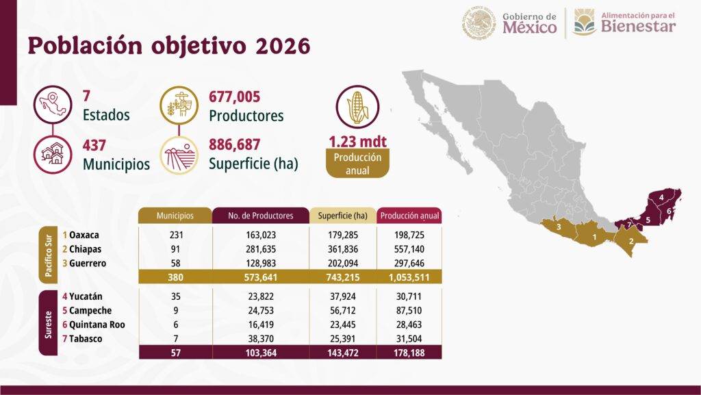 Es decir, comenzando en 2026 en el sureste y Pacífico sur, atendiendo a 677 mil 005 familias productoras de maíz con 886 mil 687 hectáreas en 437 municipios de siete estados de la República.