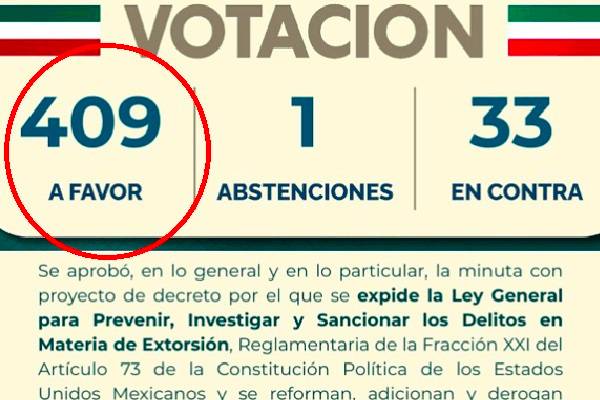 La Cámara de Diputados aprobó la Ley contra la extorsión, con hasta 42 años de cárcel PAN y PRI registraron 33 votos contrarios en lo particular