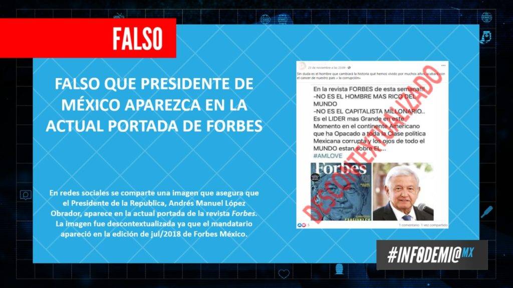 #FakeNewsAlert#Falso que el Presidente @lopezobrador_ aparezca en la actual portada de la revista @Forbes_Mexico. La portada que circula en redes sociales corresponde a una edición de la revista de 2018.