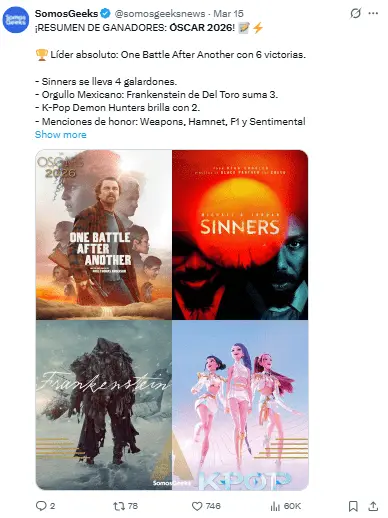 Regeneración, 17 de marzo 2026– «Una batalla tras otra» se ha destacado como la gran ganadora de los Oscar 2026. La obra de Paul Thomas Anderson llegó a la gala de este domingo con 13 nominaciones y se llevó seis estatuillas: