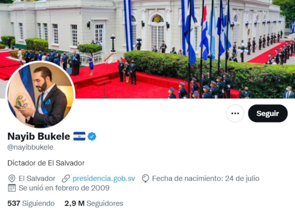 El primer mandatario del Salvador, Nayib Bukele, cambió su descripción en Twitter de «presidente» a «dictador» la noche de ayer, tras las críticas que ha recibido de su gobierno.