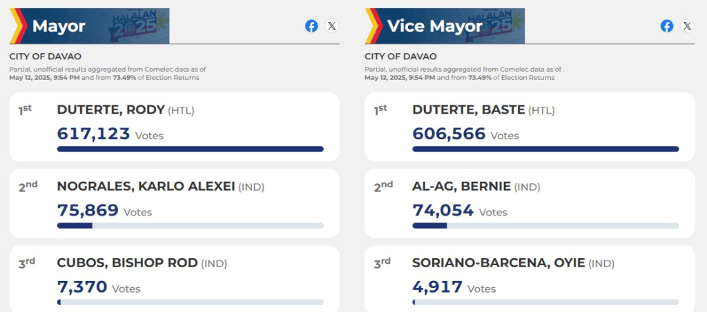 Esto es, obteniendo más de 620 mil votos, muy por encima de su rival Karlo Alexei Nograles, quien alcanzó 77 mil 240 votos.
