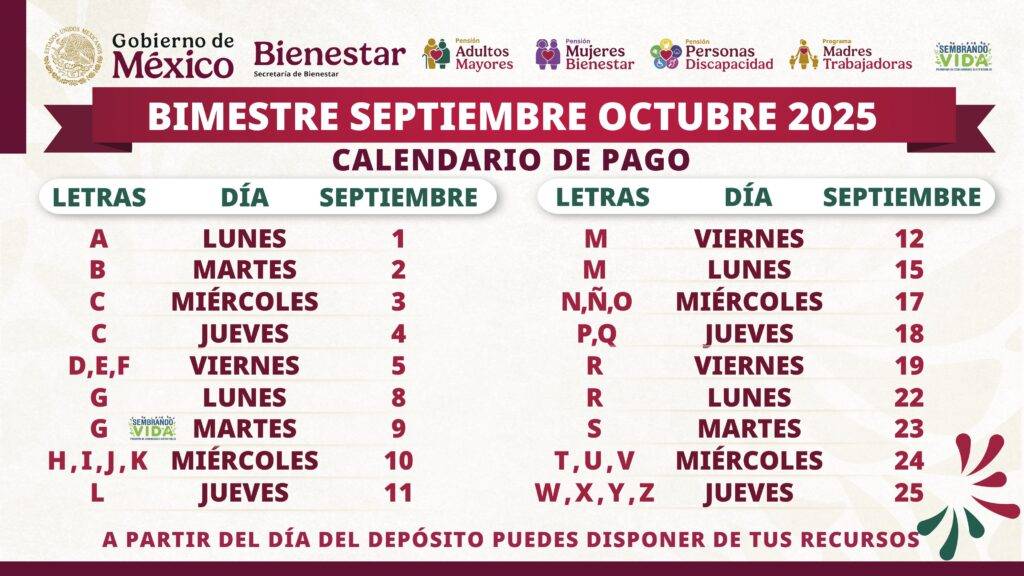 Finalmente, se indica que los pagos se realizan de acuerdo con la primera letra del apellido paterno, según el siguiente calendario: