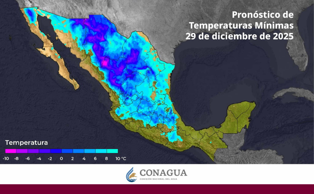 Y temperaturas mínimas de -10 a -5 °C con heladas en zonas serranas de Baja California, Chihuahua y Durango.