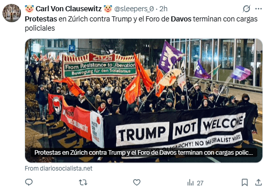 «Trump no es bienvenido» y “Tira a Trump a la basura”, fueron algunas de las frases escuchadas en las calles, mientras manifestantes incineraban banderas estadounidenses en Suiza.