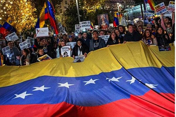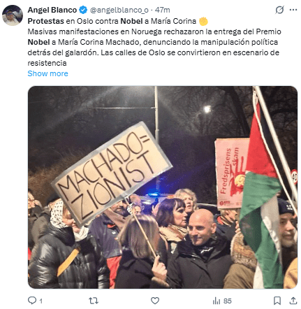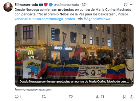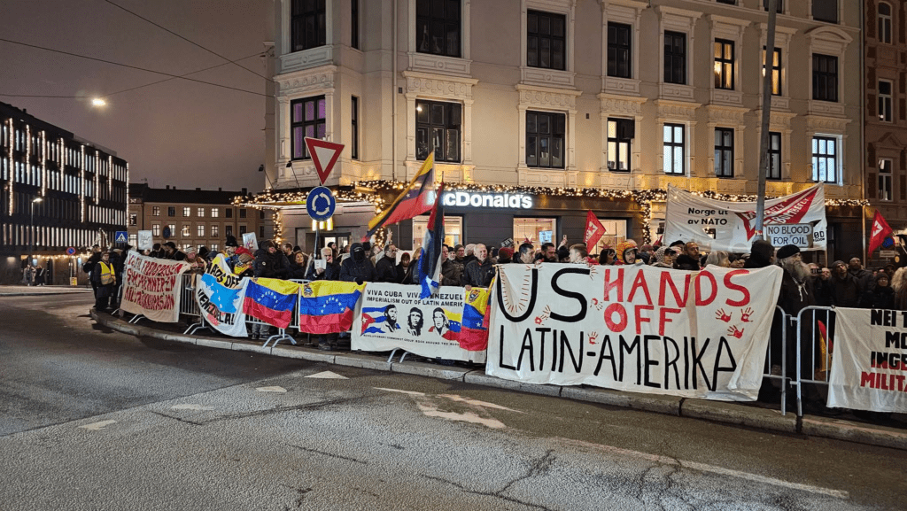 Regeneración, 10 de diciembre 2025– Unas 200 personas participaron este martes en una concentración impulsada por media docena de organizaciones noruegas contra la concesión del Nobel de la Paz a la opositora venezolana María Corina Machado.