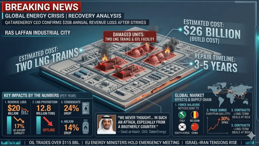 Regeneración, 19 de marzo de 2026. En una entrevista exclusiva con Reuters el Ministro de Energía de Qatar y CEO de QatarEnergy, Saad al-Kaabi, confirmó que los ataques iraníes contra la Ciudad Industrial de Ras Laffan han inutilizado el 17% de la capacidad de exportación de Gas Natural Licuado.