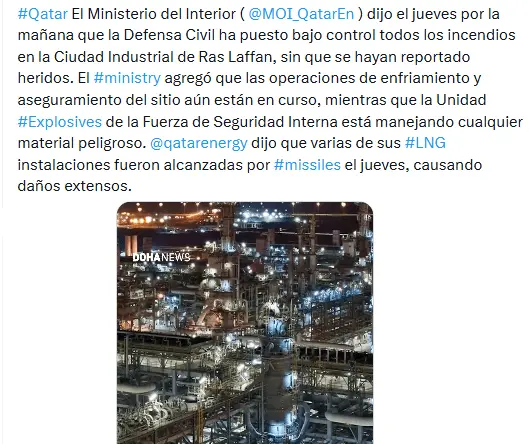 Al tiempo que AFP subraya que Qatar afirmó que «conserva su derecho, amparado por el derecho internacional, a responder a los ataques de Irán contra las instalaciones de GNL».