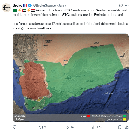 Regeneración, 15 de enero 2026– El gobierno de Yemen, conocido como Consejo de Liderazgo Presidencial (PLC), ha declarado que sus tropas han recuperado dos provincias clave en el sur, revirtiendo una toma de control de un mes por parte del Consejo de Transición del Sur (STC).