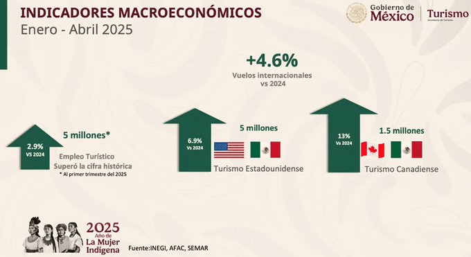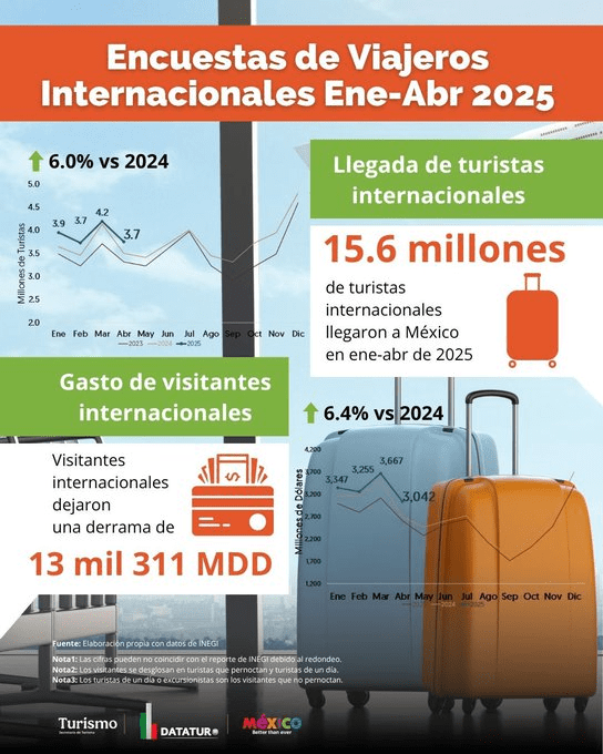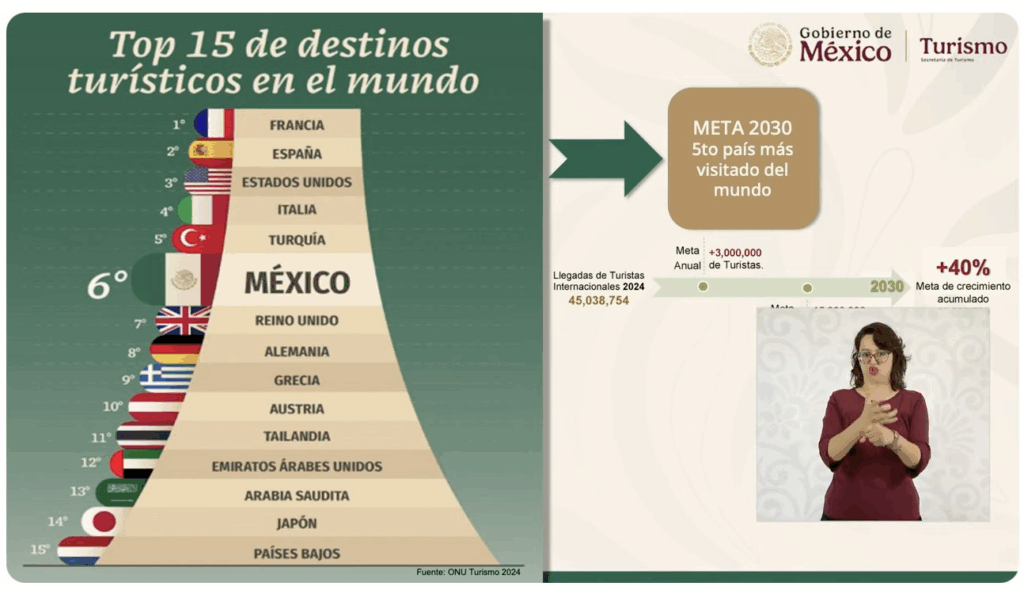E incluso detalló que llegaron 31.5 millones de visitantes internacionales, 13.3 por ciento más que en 2024; 15.6 millones de turistas internacionales, 6 por ciento más que en 2024.