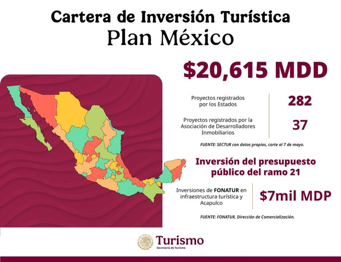 Detalló un Portafolio de Inversión Turística Nacional y Extranjera 2025 – 2030 es de 20 mil 615 millones de dólares, con 282 proyectos que se instalarán en 22 estados, de esta inversión 41.7 por ciento es extranjera y 54 por ciento es nacional.
