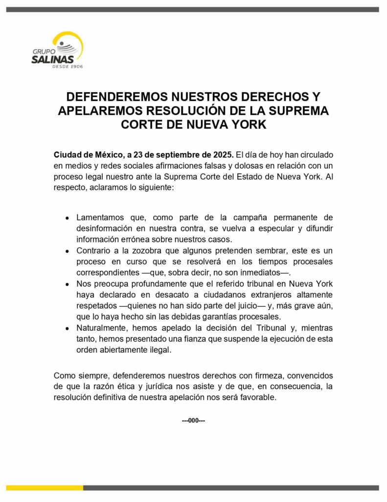 “Salinas y sus empresas depositaron una fianza conjunta de US$25 millones antes del plazo de dos semanas fijado por Masley, pero también están apelando la sentencia”.