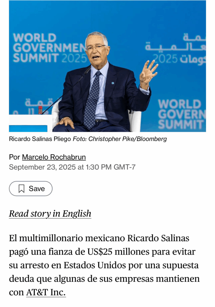 Regeneración, 23 de septiembre de 2025. En redes destacan que Salinas Pliego tuvo que pagar 25 millones de dólares por imposición de un juzgado de Nueva York en demanda por venta de Iusacell.