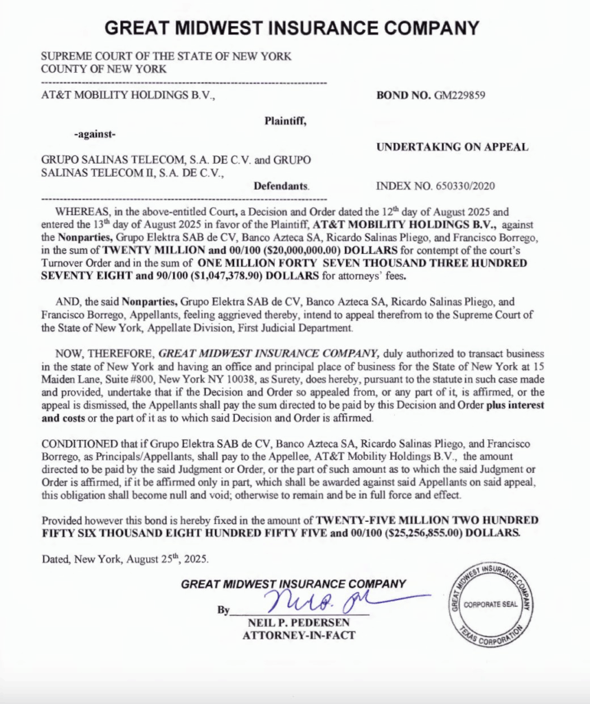 Esto, para pagar los daños a AT&T Mobility Holdings B.V. y New Cingular Wireless Services que compró Iusacell, la empresa de Salinas, en 2015 por 2.5 millones de dólares.