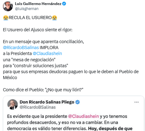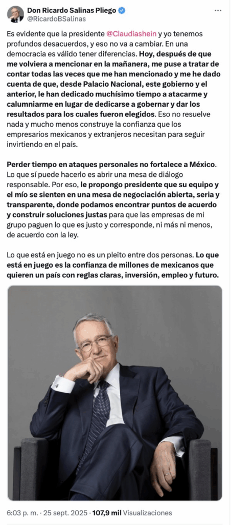 Regeneración, 25 de septiembre de 2025. Ricardo Salinas Pliego respondió a la presidenta Sheinbaum y le propone una mesa de negociación para pagar lo que sus empresas deben.