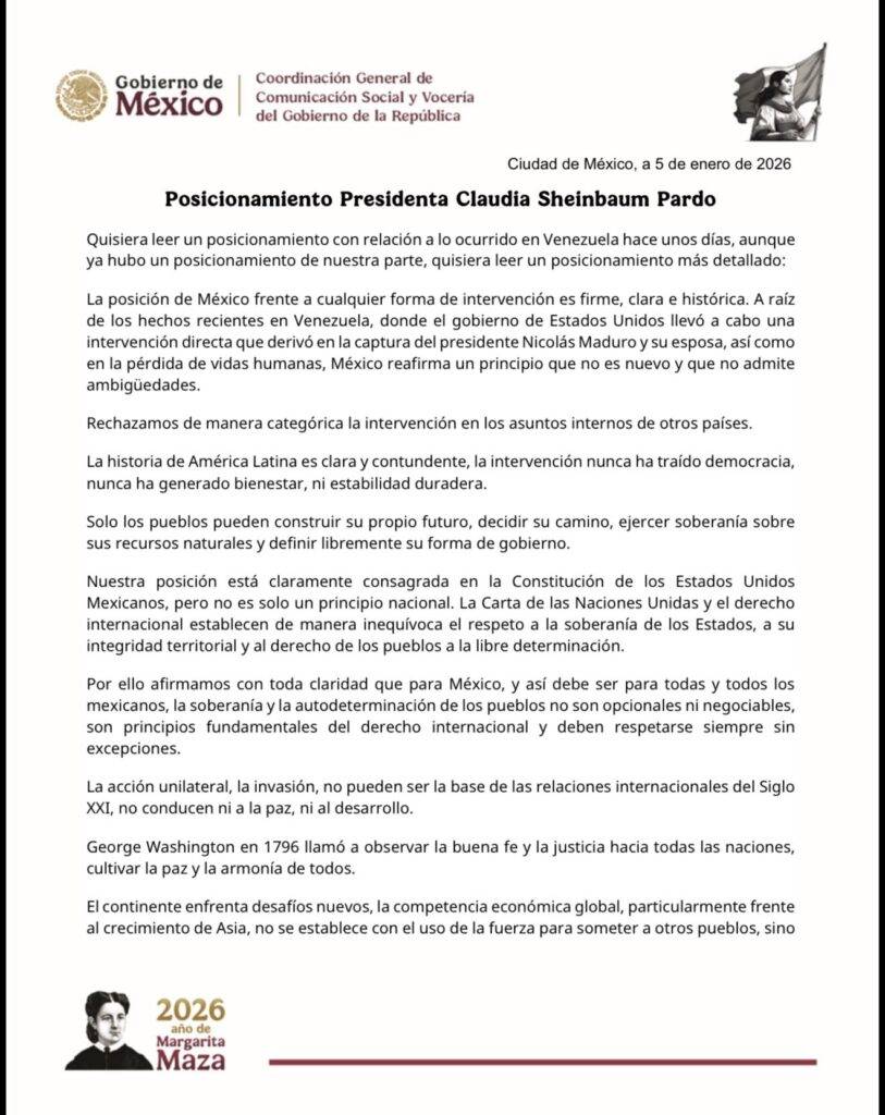 Regeneración, 5 de enero de 2026.– La dignidad nacional no se negocia. La Presidenta Claudia Sheinbaum Pardo lanzó un mensaje contundente sobre Venezuela. Fustigó la intervención directa de Estados Unidos que derivó en la captura de Nicolás Maduro.