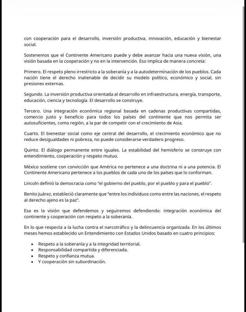 Citó a defensores de la soberanía como Benito Juárez y el estadounidense Abraham Lincoln. El respeto es la paz.