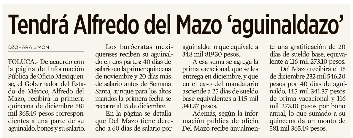 Regeneración, 12 de noviembre de 2018. ¿Qué haría uno con un aguinaldo de medio millón de pesos? Esa es la cifra que recibirá el gobernador del Estado de México, Alfredo del Mazo, como gratificación de fin de año este 2018.