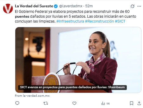 Regeneración, 16 de octubre 2025– Las comunidades incomunicadas pasaron de 191 a solo 160, además de que hay puentes aéreos en aquellos lugares donde aún no hay comunicación. Cerca de mil máquinas de la SICT, así como muchísimas personas trabajan para abrir los caminos.