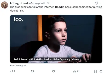 Regeneración, 25 de febrero 2026– La Oficina del Comisionado de Información (ICO) ha multado a Reddit con más de 14 millones de libras (casi 19 millones de dólares), al considerar que la red social no ha salvaguardado a los menores y los ha dejado expuestos a «contenido inapropiado y dañino».