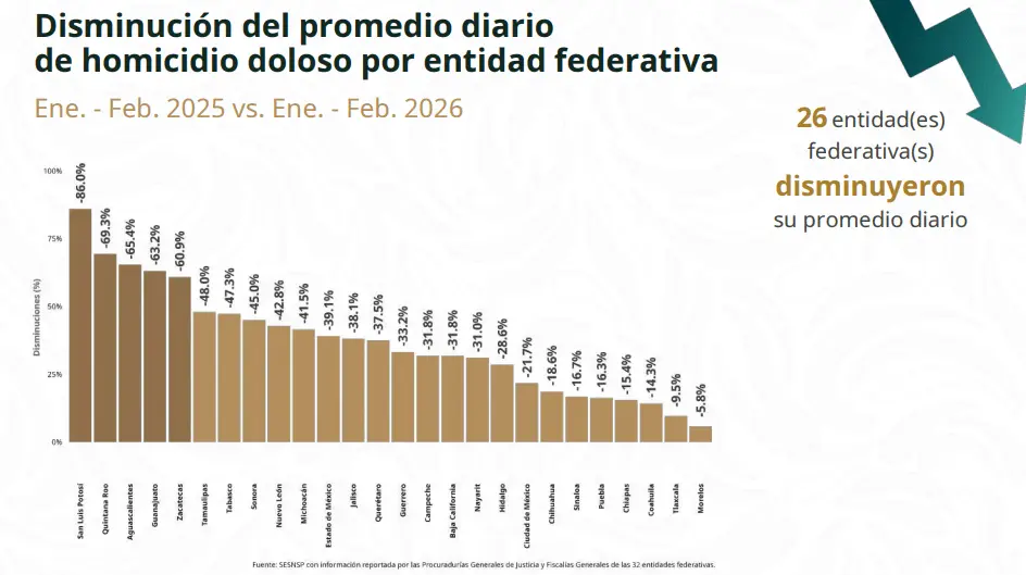 Agregó que, al comparar el primer bimestre de 2025 contra el mismo periodo de 2026. Así, 26 entidades federativas disminuyeron su promedio diario de homicidios, respecto a febrero 2025.