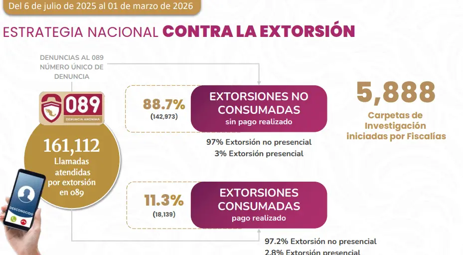 Con la Estrategia Nacional contra la Extorsión, del 6 de julio de 2025 al 1 de marzo de 2026, se detuvo a 907 extorsionadores en 24 entidades.