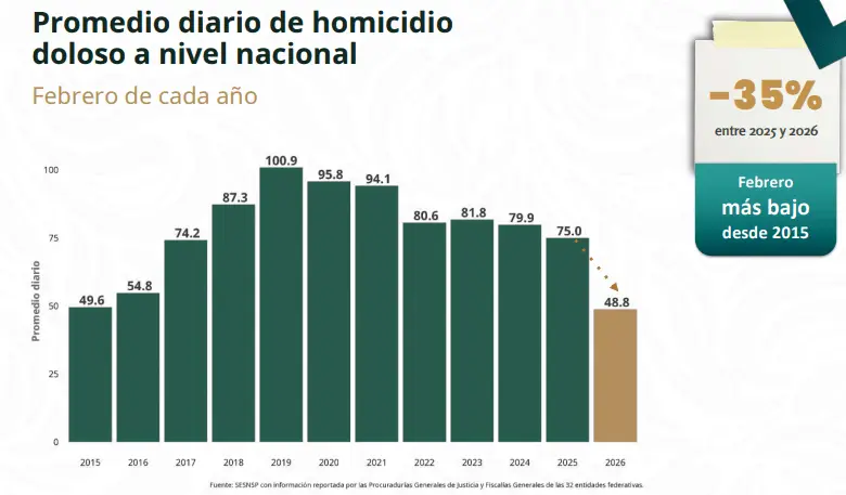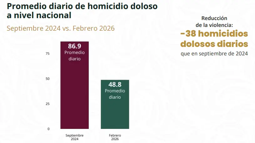 Y es que el promedio diario de víctimas de homicidio doloso se redujo de 86.9 en septiembre 2024 a 48.8 en febrero 2026.