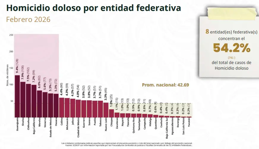Señaló que durante febrero de este año, ocho entidades federativas concentraron el 54.2 por ciento del total de homicidios dolosos.