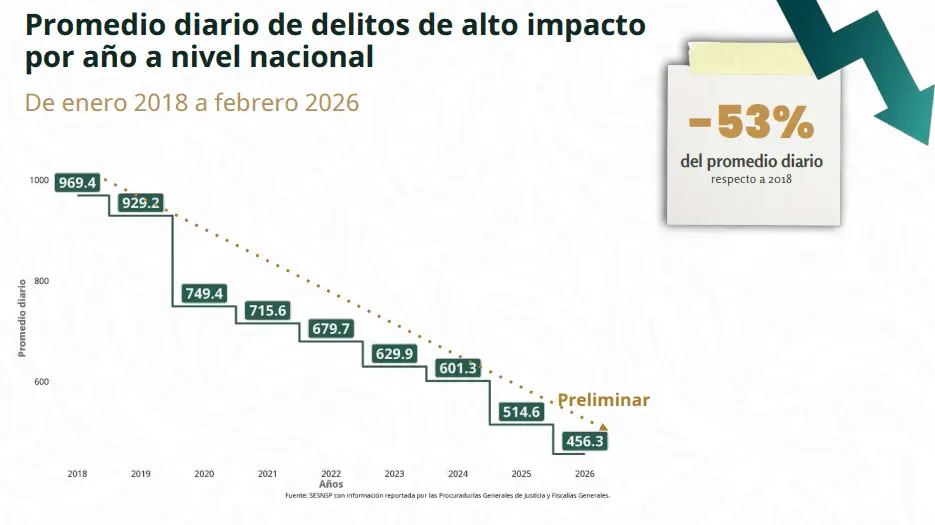 Esto, al pasar de 969.4 a 456.3. Con estas cifras, 2026 se perfila como el año más bajo en la incidencia de este tipo de delitos.