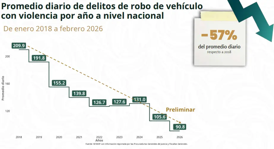 La titular del Secretariado Ejecutivo del Sistema Nacional de Seguridad Pública, Marcela Figueroa Franco, detalló que entre 2025 y 2026 el promedio diario de homicidios dolosos presentó una reducción del 35 por ciento, al pasar de 75 a 48.8.