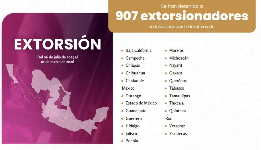 Y con la Estrategia Nacional contra la Extorsión, del 6 de julio de 2025 al 1 de marzo de 2026, se han detenido a 907 extorsionadores en 24 entidades.