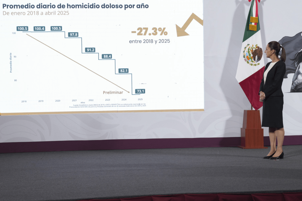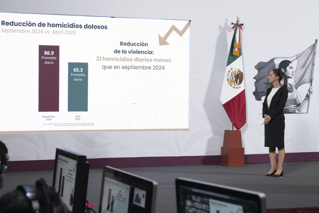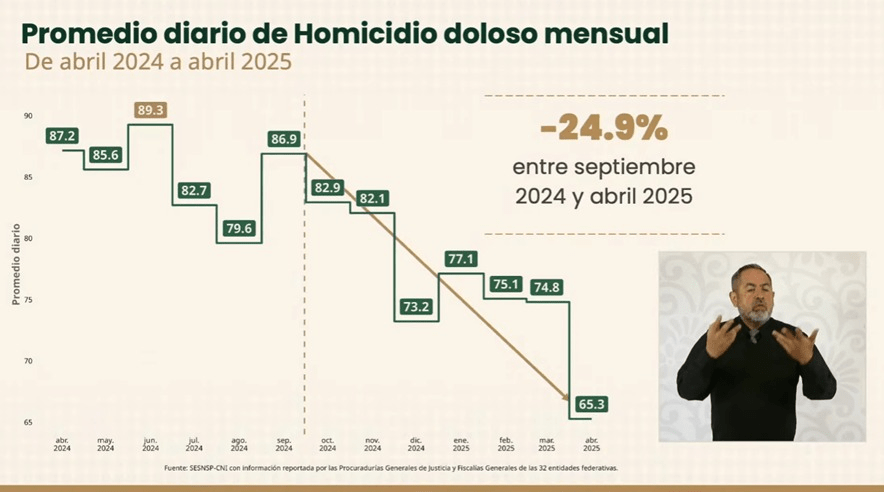 Esto es, pasando de 86.9 en septiembre de 2024 a 65.3 en abril de 2025, lo que equivale a 21 homicidios menos diarios.