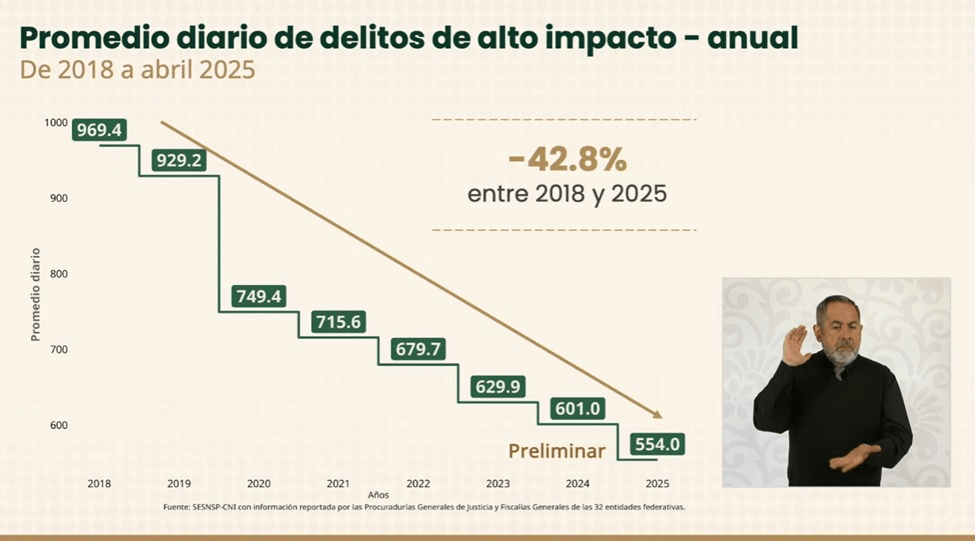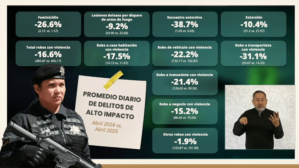 En cuanto a delitos de alto impacto, se reportó una reducción del 19.25% entre octubre de 2024 y abril de 2025.