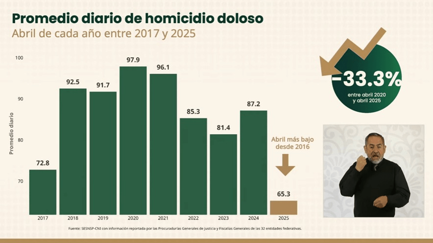 Así, dijo que entre febrero y abril de 2025 se presentó una reducción de 48.9 por ciento en el promedio diario de homicidio doloso.